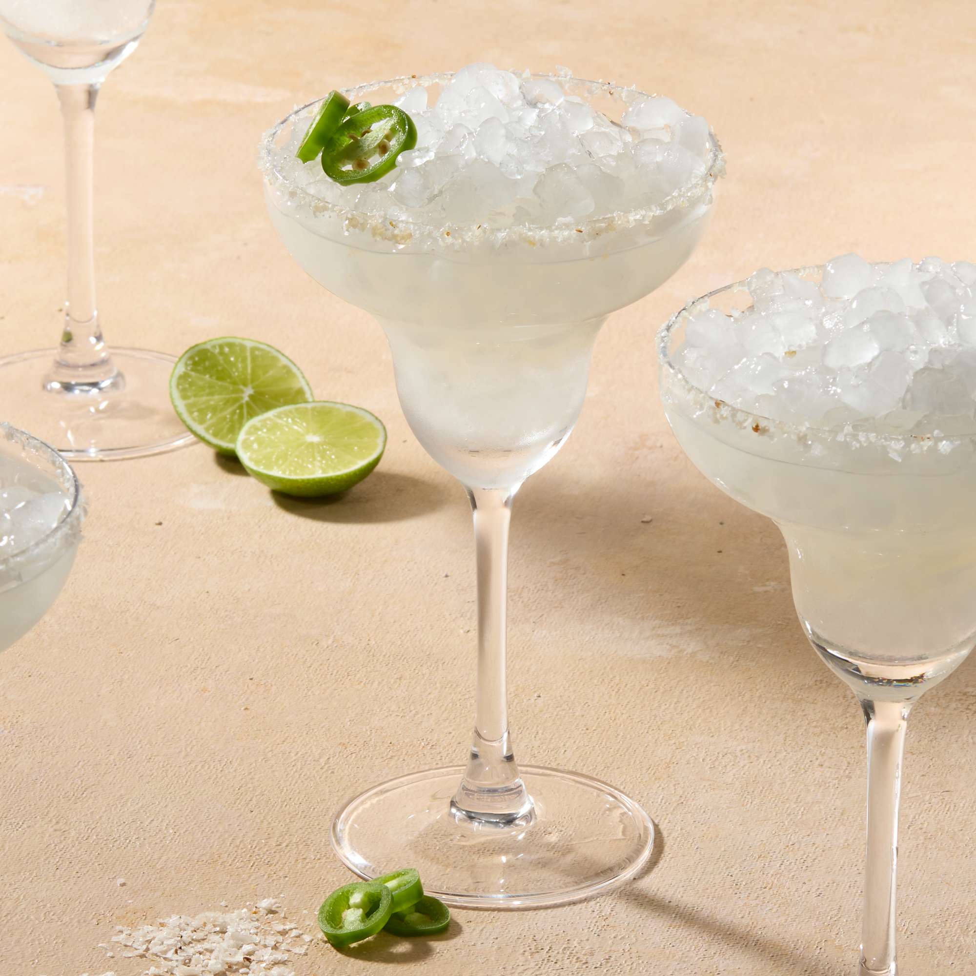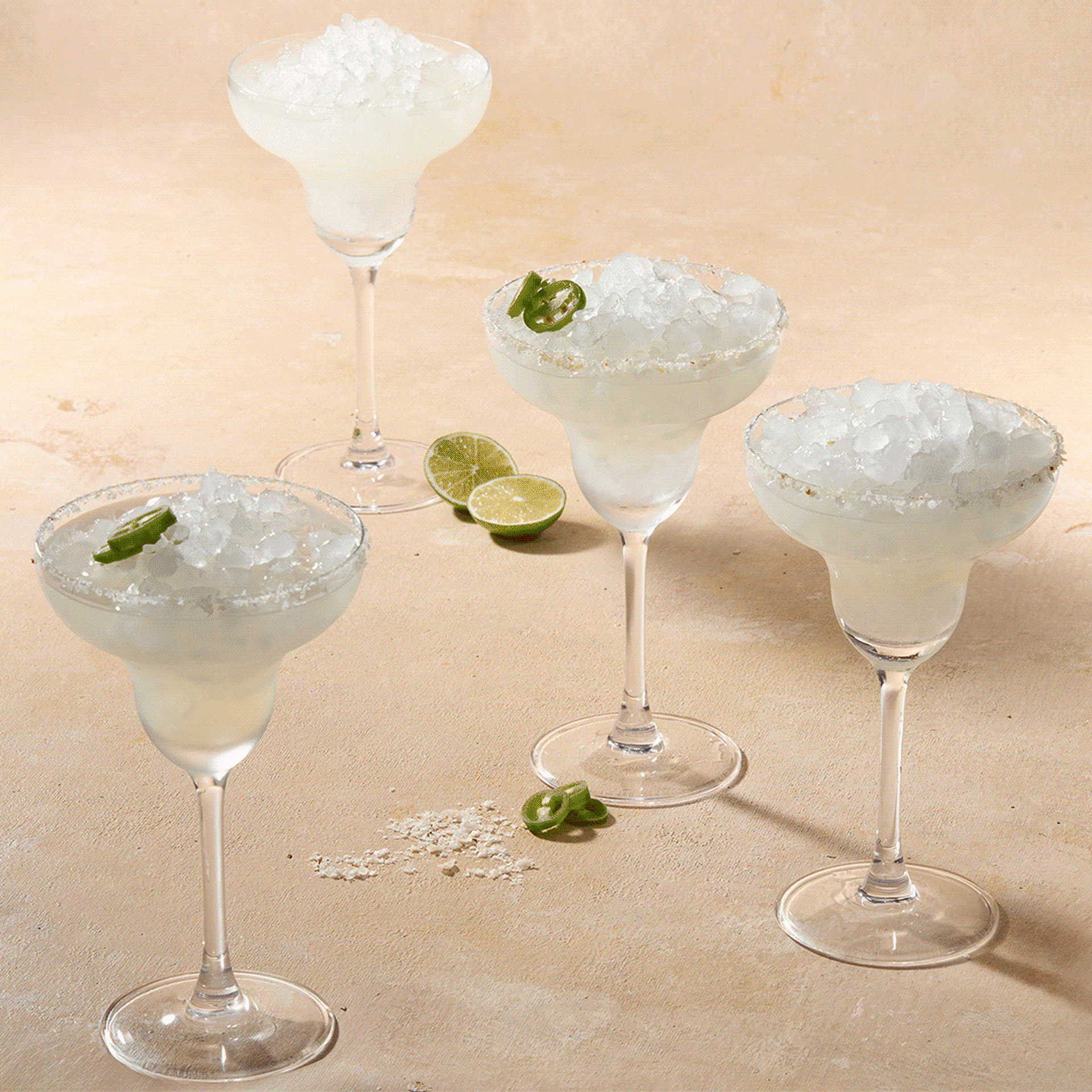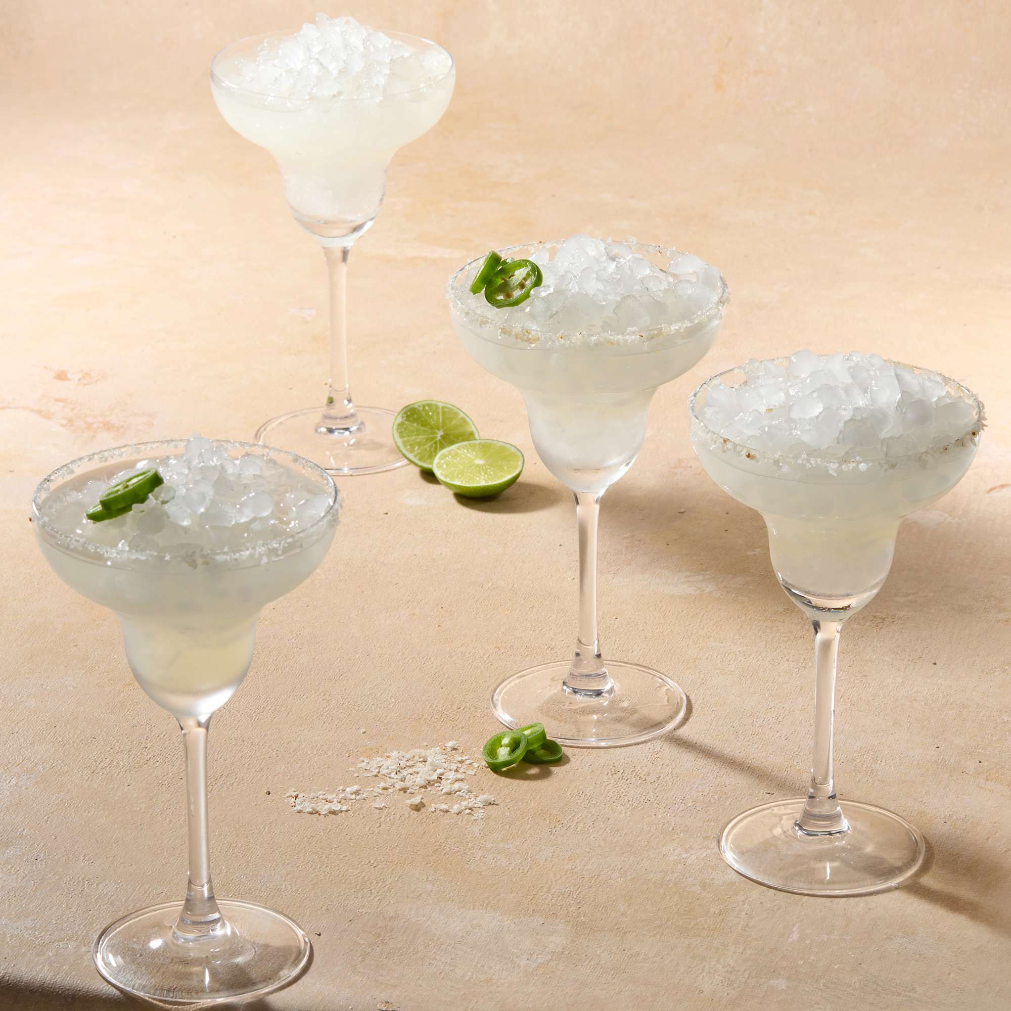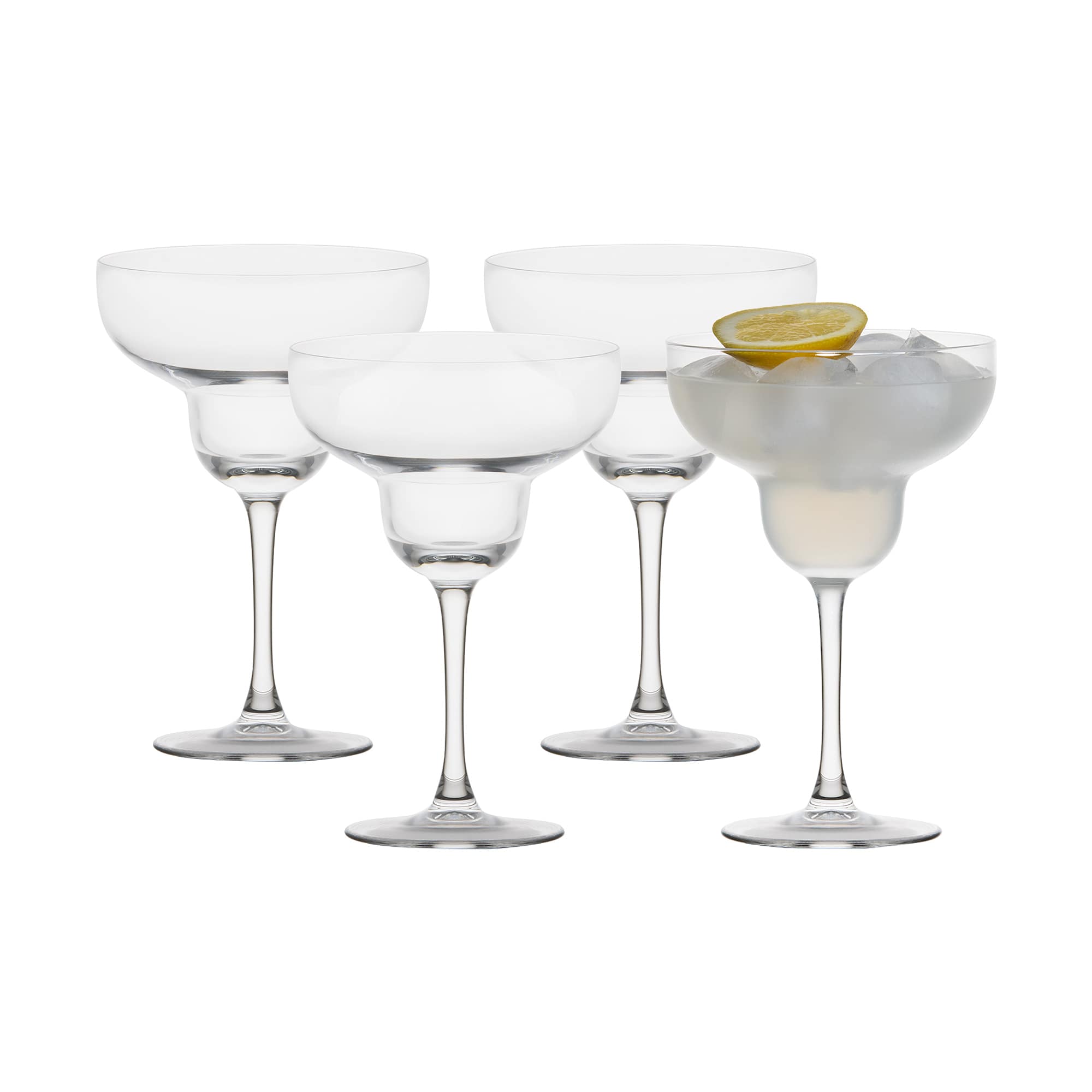 - Set of four margarita glasses with a distinctive stepped bowl and wide rim