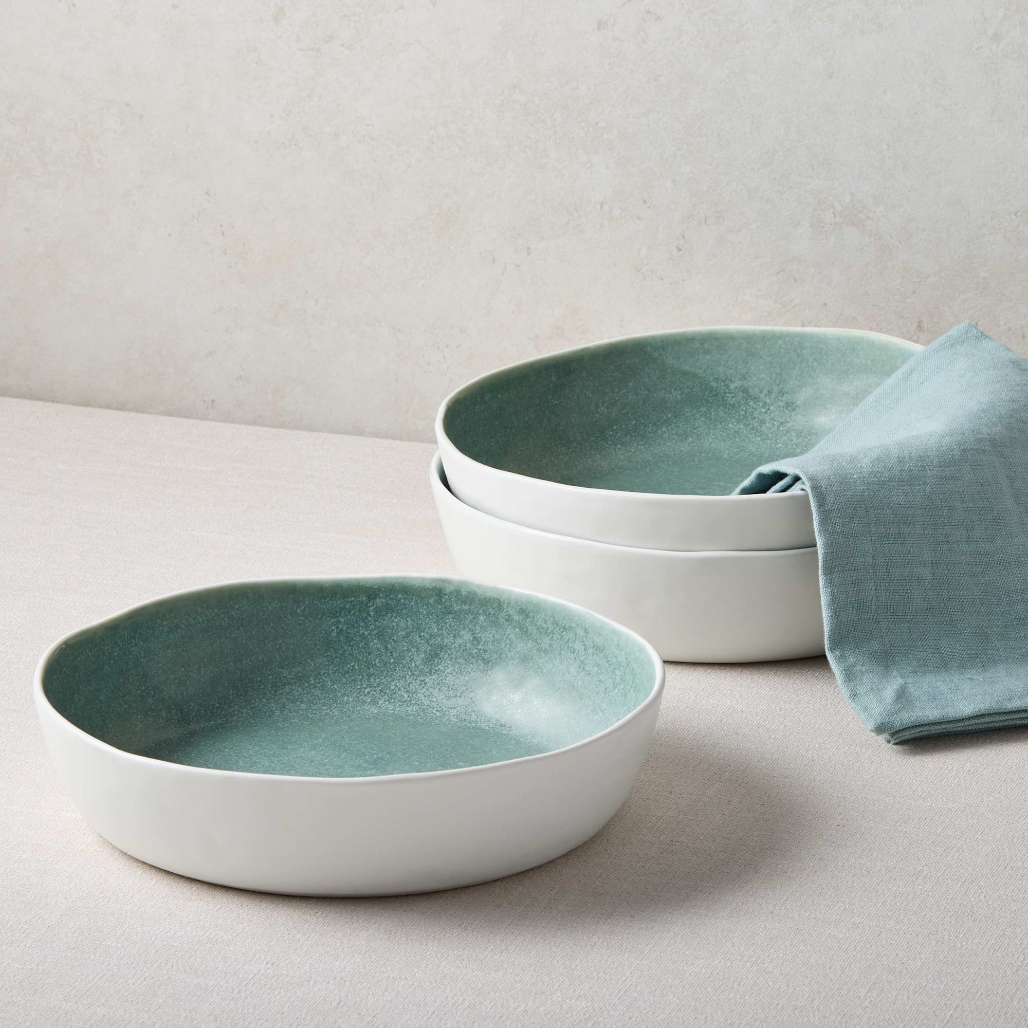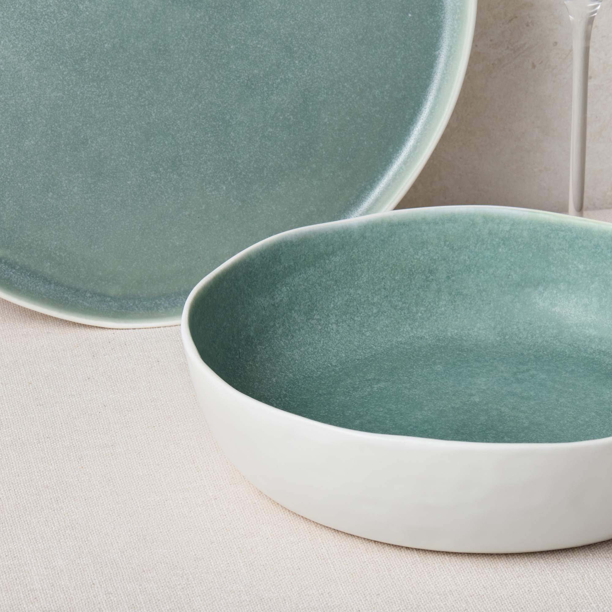 Salisbury & Co Maison embodies the perfect blend of sophistication and natural allure. Crafted from heat retentive porcelain and glazed with a soft seafoam colour, each piece boasts a unique, organic shape and works well in casual or formal settings. The unglazed ceramic bases are gentle on table surfaces while lending each piece an artisanal appearance.