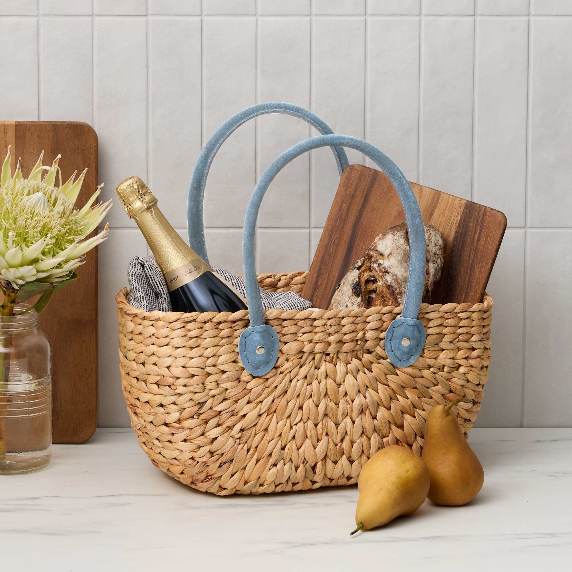 This versatile woven basket looks chic and is also sturdy enough to carry groceries, hit the beach, or pack a picnic in style. The basket includes two suede handles and a wide base to keep it upright.Key Features: